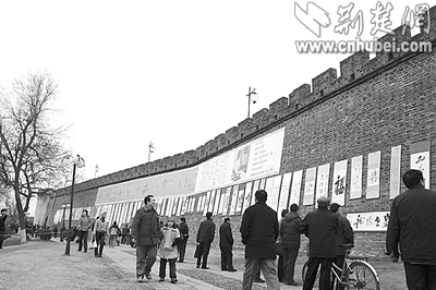 荊楚網(wǎng)(楚天都市報)(記者釋喻 攝)前日上午,襄樊西門橋古城墻上舉辦了一場別開生面的書法展,近百幅作品被懸掛在城墻上,向市民免費展出,展覽為期7天。此次活動由襄樊市文聯(lián)等單位舉辦,展出的是書法家王樹人先生的遺作和其傳人的近期作品;顒蝇F(xiàn)場還進(jìn)行了書法義賣,所得款項將用于襄樊歷史文化名城的保護(hù)和宣傳工作。