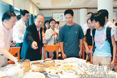 8月17日,曾憲梓與本報(bào)受助學(xué)子赴港參觀團(tuán)座談。中午12點(diǎn),曾憲梓老人興致勃勃地對(duì)同學(xué)們說:“孩子們,走,中午曾爺爺請(qǐng)你們吃茶點(diǎn)!”