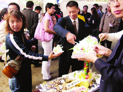 這個(gè)匠心獨(dú)運(yùn)的蛋糕由妞妞公司制作贈(zèng)送。其主體部分是一條飛龍,并書有“飛龍?jiān)谔臁弊謽印ow龍一側(cè),則是一只“神舟六號”航天飛船模型。