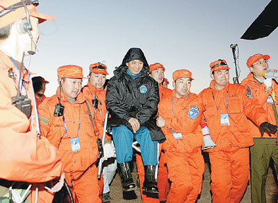 轉(zhuǎn)眼之間,艙門已被打開。費俊龍、聶海勝向人們揮動著手臂,輕快出艙。細心的工作人員,已經(jīng)在艙門外為他們擺好了兩把椅子。
