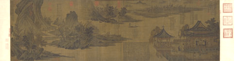 此圖是一幅山水人物畫,畫卷的開(kāi)首部分便是吳興南園一角,主體建筑為一座重檐歇山頂?shù)臉情w,相配小亭欄桿回環(huán)曲折,花草樹(shù)木掩映,庭中有鶴,亭角有花一株,環(huán)境幽雅而氣象恢宏。樓閣內(nèi),馬太守正陪二老對(duì)坐奕棋;小亭內(nèi),二老手扶欄桿,一面賞景一面閑話;另二老或攜琴或曳杖,款款而來(lái)。此外有童仆衙役陪伴侍候。這是一次風(fēng)流儒雅的集會(huì),輕松愉快,表現(xiàn)出一派太平盛世的氣氛。這一段表現(xiàn)了三首詩(shī)的內(nèi)容,除前述一首之外,另有《庭鶴》、《玉蝴蝶花》二首