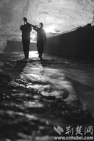 寂寞的蝙蝠第一次接待了人間來(lái)客,沉睡萬(wàn)年的巖溶洞穴第一次迎來(lái)了觀者。但黑暗陌生的世界還是讓堂堂男兒們感覺(jué)了一絲陰森恐怖。他們?cè)?tīng)當(dāng)?shù)匕傩諅髡f(shuō),洞里有巨蟒,所以至今沒(méi)人敢進(jìn)洞!白ゾo時(shí)間測(cè)量!”來(lái)不及恐懼,他們?yōu)樽约汗膭,因(yàn)檫@里隨時(shí)可能發(fā)生漲水、墜落等危險(xiǎn)?上,第一次經(jīng)驗(yàn)不足,手電筒的電池很快用完了,一行人只得互相攙扶著,摸索出溶洞。“后來(lái),我們又進(jìn)去了7次,終于測(cè)出了暗河的具體位置和流向。”方文武說(shuō)。