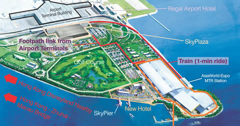 亞洲國(guó)際博覽館選址大嶼山香港國(guó)際機(jī)場(chǎng)附近,可通過(guò)完善的海陸空交通網(wǎng)絡(luò),連接全球各大主要城市。渡輪服務(wù)和完備的陸路交通配套設(shè)施,將博覽館連接至珠江三角洲城市及澳門等地。亞洲國(guó)際博覽館是香港展覽業(yè)持續(xù)發(fā)展的重要建設(shè)項(xiàng)目,將與現(xiàn)在位于灣仔的香港國(guó)際會(huì)展中心形成互補(bǔ)。