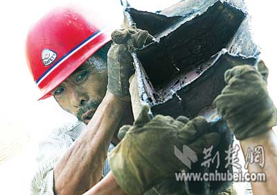 現(xiàn)場(chǎng)施工的8名農(nóng)民工都來自監(jiān)利縣。他們有的用焊槍切割船體,有的將割好的鋼板搬到岸上。每塊鋼板重約80公斤,兩個(gè)人抬著走,豆大的汗珠布滿黝黑的臉龐,隨著移動(dòng)的腳步一滴滴滾落地上。