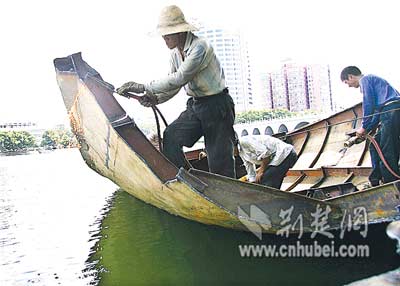 “船太大了,沒辦法運(yùn)出城,只好進(jìn)行分解后運(yùn)走!必(fù)責(zé)現(xiàn)場(chǎng)施工的馬先生解釋,2002年初,他所在的公司承攬東湖清淤工程,共運(yùn)來8條清淤船,其中一條船放置在水果湖。當(dāng)時(shí),經(jīng)有關(guān)部門批準(zhǔn),這些船由大型車輛運(yùn)來并吊入湖中。目前清淤工程結(jié)束,湖中的船不好運(yùn)走,只好割成一塊塊鋼板,當(dāng)成廢鋼賣掉。