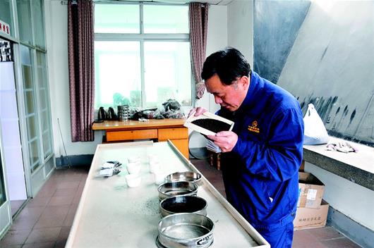 圖為:甘多平在檢驗(yàn)磚茶原料。(視界網(wǎng) 童金健 攝)