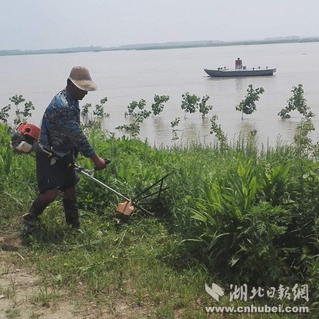 站在簰洲灣堤上,只見江水寬闊,水質(zhì)混濁,岸邊的防浪林樹干已被淹沒大半,只露出一蓬蓬的樹枝。原本空曠的堤頂公路,多了一些哨棚。內(nèi)岸邊,星散分布的群眾,手持鐮刀或除草機,正在忙碌地清障除雜。每隔一段距離,都有一個防汛哨屋,鮮艷的五星紅旗迎風飄揚,各個分指揮部已經(jīng)設立。