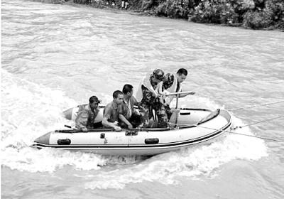 消防官兵在激流中施救被困的群眾