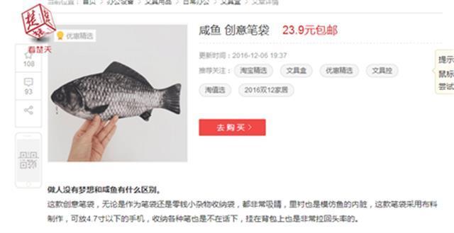 據(jù)了解,“咸魚”筆袋的主人是個(gè)初一孩子,記者聯(lián)系他的媽媽后得知,筆袋是孩子在網(wǎng)上挑選后,她購(gòu)買的。“不知道他為什么喜歡這個(gè)筆袋。”事后,記者在淘寶、京東上搜索“咸魚筆袋”后,也確實(shí)發(fā)現(xiàn)了類似的筆袋。
