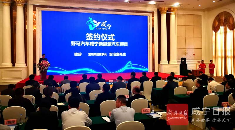 4月12日,咸寧市舉行野馬汽車咸寧新能源汽車項目簽約儀式。市委書記、市人大常委會主任丁小強,富臨集團董事長安治富,市委副書記、市長王遠鶴,富臨集團副總經(jīng)理藤明波,四川野馬汽車股份有限公司總經(jīng)理譚建偉見證簽約。