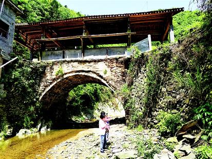 石城鎮(zhèn)文化站站長(zhǎng)龔益來(lái)介紹,2015年6月2日暴雨,石橋部分被沖毀。他聯(lián)系上從塔坳村走出去的加拿大籍華人汪十友,募資10萬(wàn)元,加上鄉(xiāng)鄰捐助,花費(fèi)13萬(wàn)余元于當(dāng)年9月重修。為整舊如舊,橋基上的壘石仍保留當(dāng)年瑤族先民的遺存,清光緒十四年的修橋記錄原樣保存在前面橫梁上,此次修橋記錄則刻在后面橫梁上。
