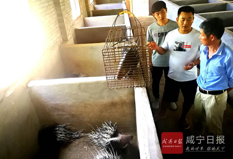 21日,通山縣大路鄉(xiāng)東坑村鴻鑰豪豬基地,當(dāng)?shù)丶夹g(shù)員在為貧困戶傳授技術(shù)。