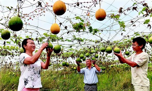 9月16日,在通城縣大坪鄉(xiāng)大坪村,麗明農(nóng)業(yè)公司員工在中藥材基地采摘瓜蔞。2014年,該村青年徐四明返鄉(xiāng)創(chuàng)業(yè),創(chuàng)辦麗明農(nóng)業(yè)公司,開發(fā)3000畝荒山播種油茶,并套種瓜蔞、白芨、黨參、玉竹等名貴中草藥。徐四明以“公司+基地+貧困戶”模式,吸收45戶貧困戶務(wù)工,戶均年收入3萬元,同時(shí)示范帶動(dòng)周邊5個(gè)村百余農(nóng)戶種中藥材增收。