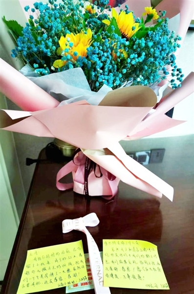 自稱為“云南小姐姐”的萬(wàn)麗萍,將一束開(kāi)得正艷的花和兩張小紙條擺在桌上?!坝窀?,我怕分別時(shí)的淚崩,給你留了小紙條。咸寧的55天,感謝你無(wú)微不至的照顧,把我們一個(gè)個(gè)養(yǎng)得胖了一大圈。雖然回去要減肥,還是感恩、感謝!”