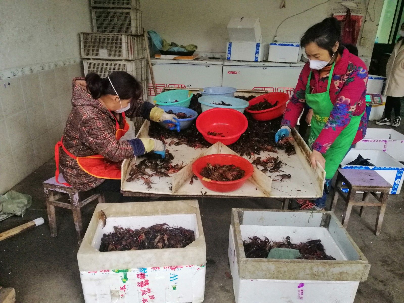 在官塘驛鎮(zhèn)泉口村神泉湖種養(yǎng)殖專業(yè)合作社,負責人童聰正在忙著將收購來的小龍蝦進行等級分揀打包,準備發(fā)往全國各地。該合作社現(xiàn)在每天小龍蝦成交量3000斤左右,高峰期保持在1.5萬斤,主要銷往江浙滬粵。