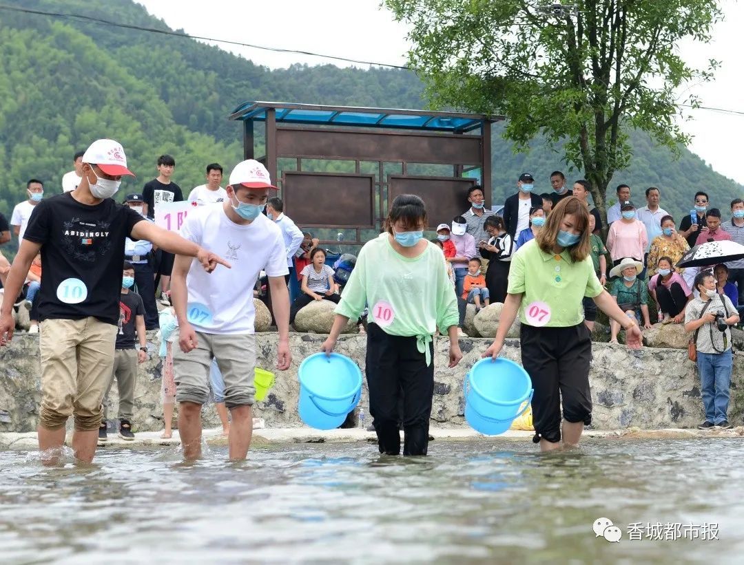 男女嘉賓脫下鞋襪、卷起褲腿下塘,女嘉賓提桶,男嘉賓負責摸魚,一雙 雙,一對對,分工更加明確,配合更加默契。一位男嘉賓捉到一條魚,在荷塘四周的 觀眾大聲喝彩中,紅著臉繞了半個塘,把魚和心意送到心儀女嘉賓的桶里。