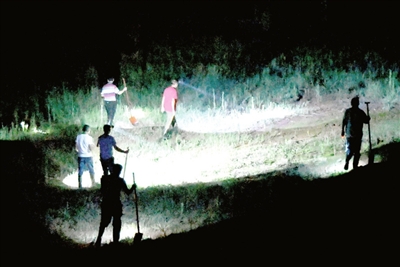 22:43分。在長江赤壁干堤11號哨所責任堤段,七束燈光在護堤林中閃耀。