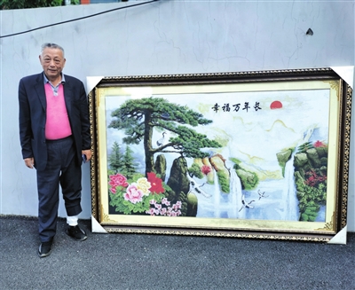 據(jù)金開珠介紹,這幅《幸福萬年長》十字繡長達(dá)3米,高達(dá)2米,由老伴王晚珍手工繡制而成。本有一位老板想以15萬元的價格收購,但因為自己和老伴的身體原因,十字繡花了三年多時間才繡好,老板等不了那么久另尋他人購買了,所以十字繡至今還沒有賣出去。