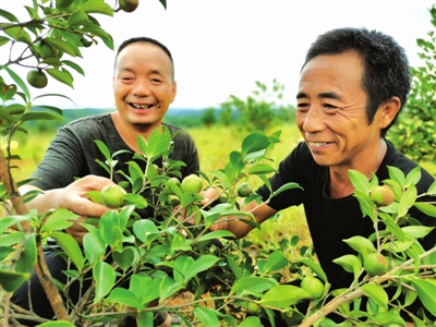 9月10日,崇陽(yáng)縣石城鎮(zhèn)漢興村村民楊四雄(右)在油茶基地查看油茶長(zhǎng)勢(shì)。