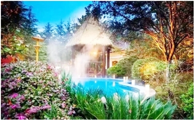 碧桂園的泉眼從上至下流,40多種湯池依據(jù)地勢高低而建。有一處名為“桂花湯”的泡池,泡池內(nèi)不僅添加了桂花的香料和養(yǎng)顏保膚的秘方,池子底部還散出金黃色的光束,隨起伏的水波搖晃,深得考察團女性的喜愛。