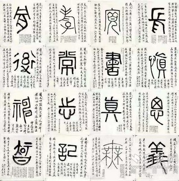 在創(chuàng)作中,陳履生用接近現(xiàn)代繪畫的方式,將字的主體以篆書寫在中心位置,周圍以行書題跋書寫注釋、個(gè)人感悟等相關(guān)內(nèi)容,強(qiáng)化對(duì)這個(gè)字的認(rèn)識(shí)過(guò)程,讓人有更深刻的理解。如開篇第二字“義”字的題跋,除了引用古籍中對(duì)義字的解讀,還加入了一句“時(shí)在國(guó)家多事之時(shí),義士善舉皆多”的感悟,與當(dāng)時(shí)“大疫當(dāng)前有大義”的情境十分貼合。
