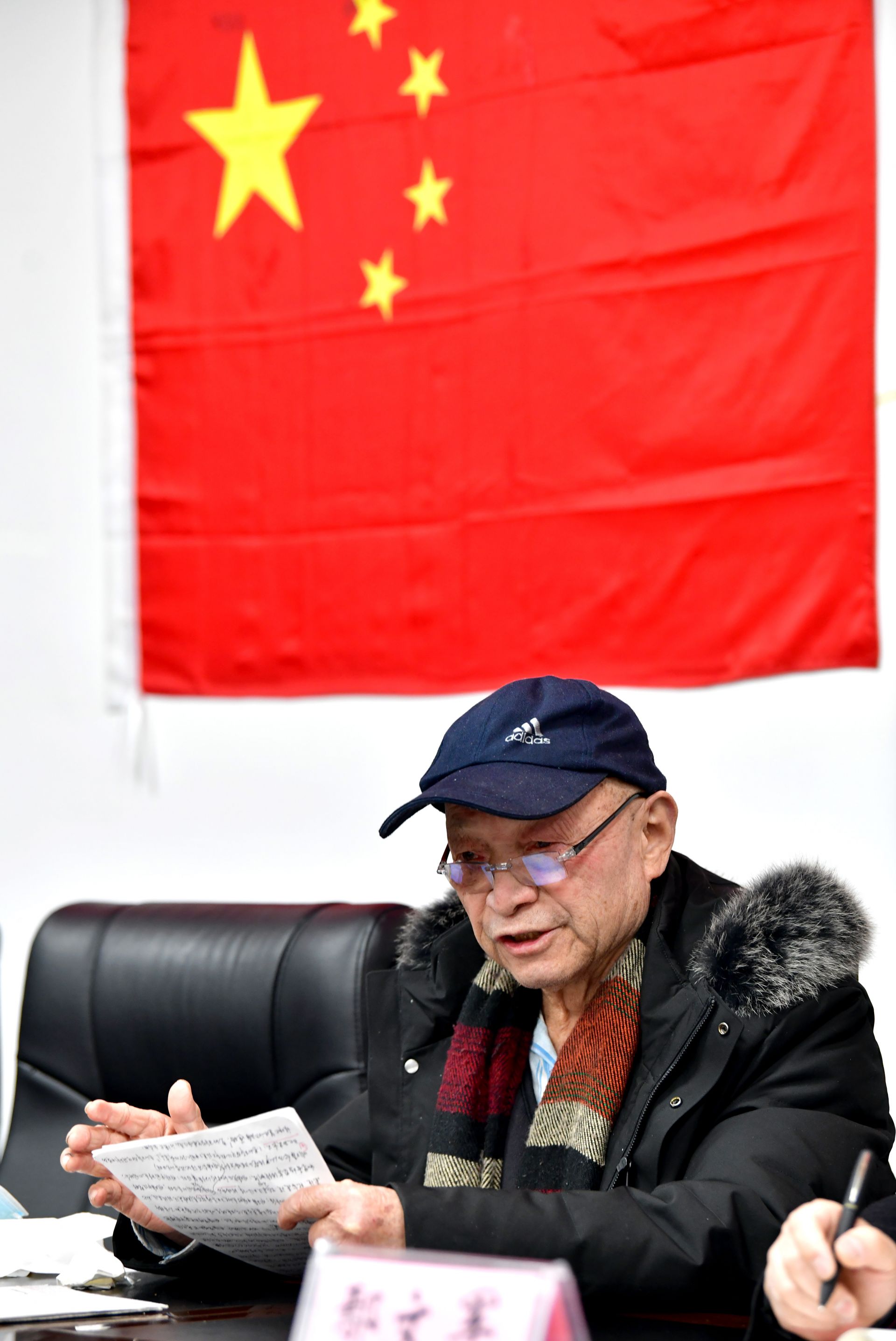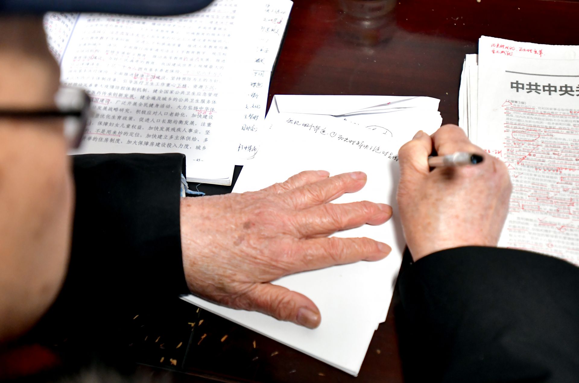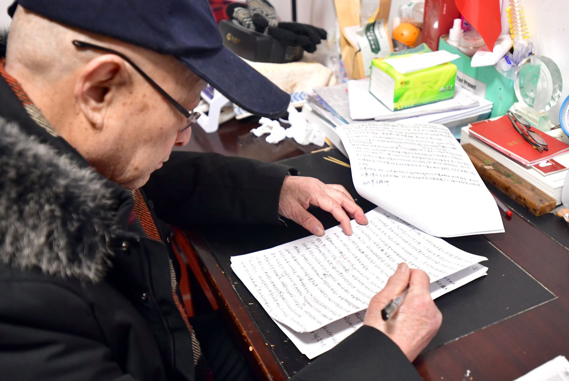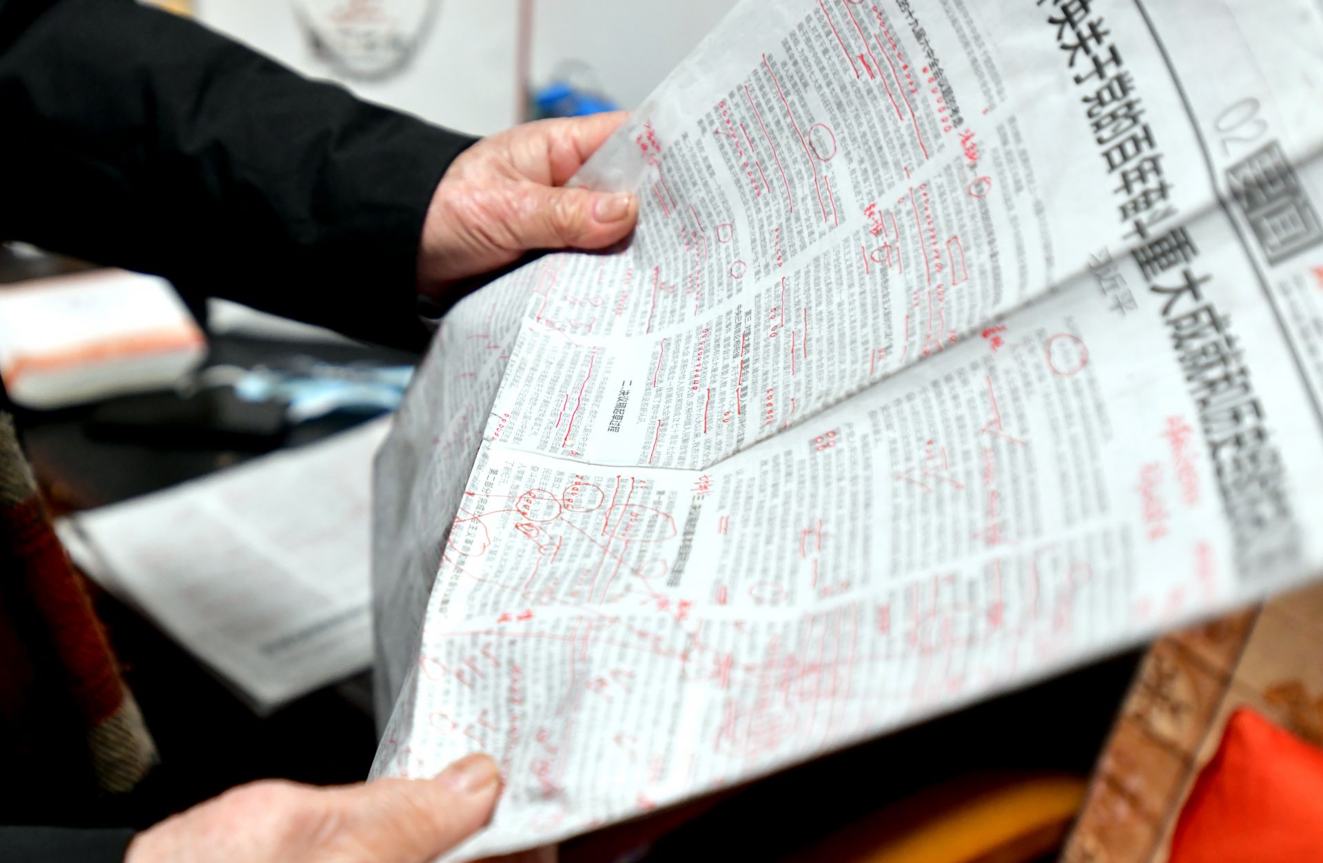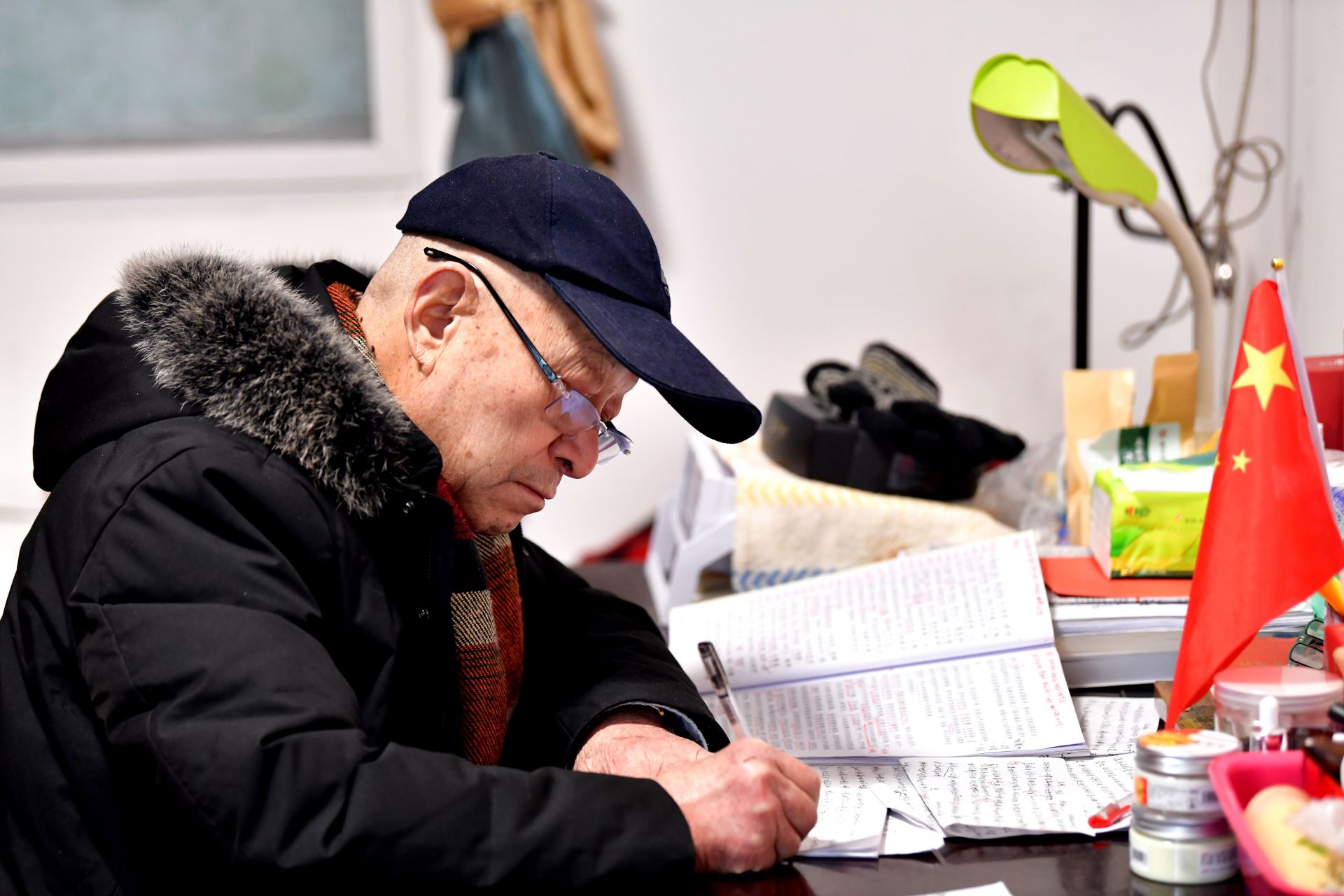 他的書桌上堆滿了厚厚的書籍,筆筒插著一面小國(guó)旗,面前攤開的報(bào)紙上,紅色的標(biāo)注分外醒目。老人正一筆一劃、不疾不徐地做著筆記。