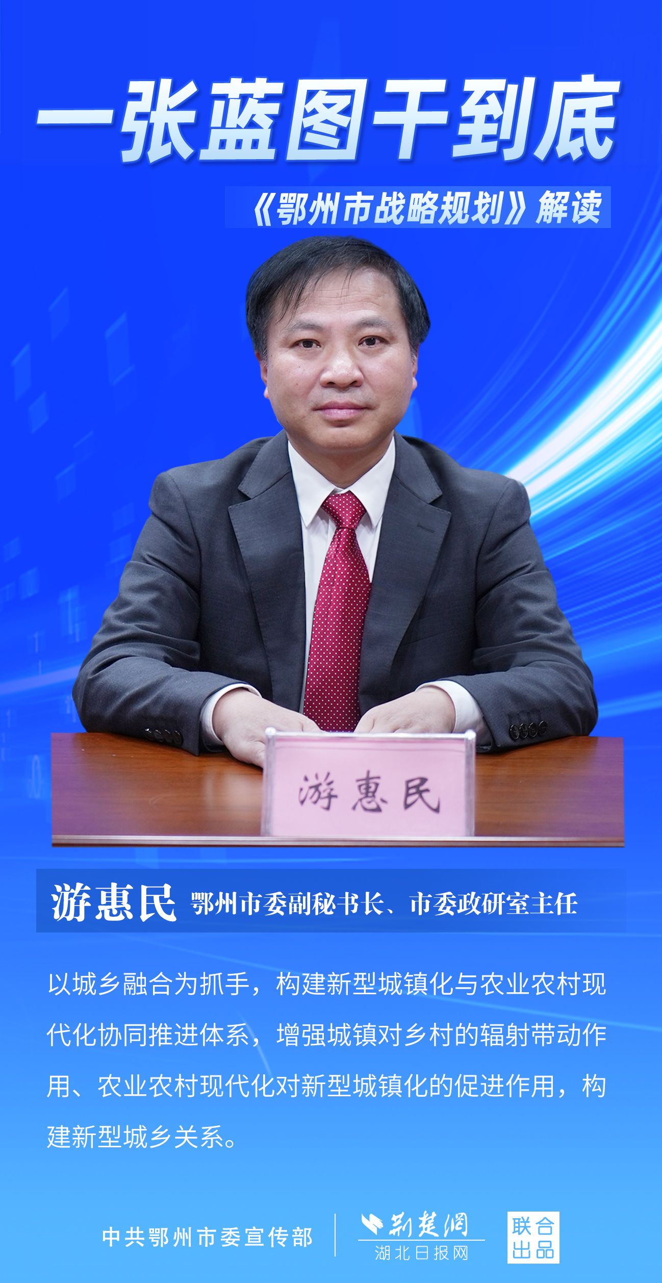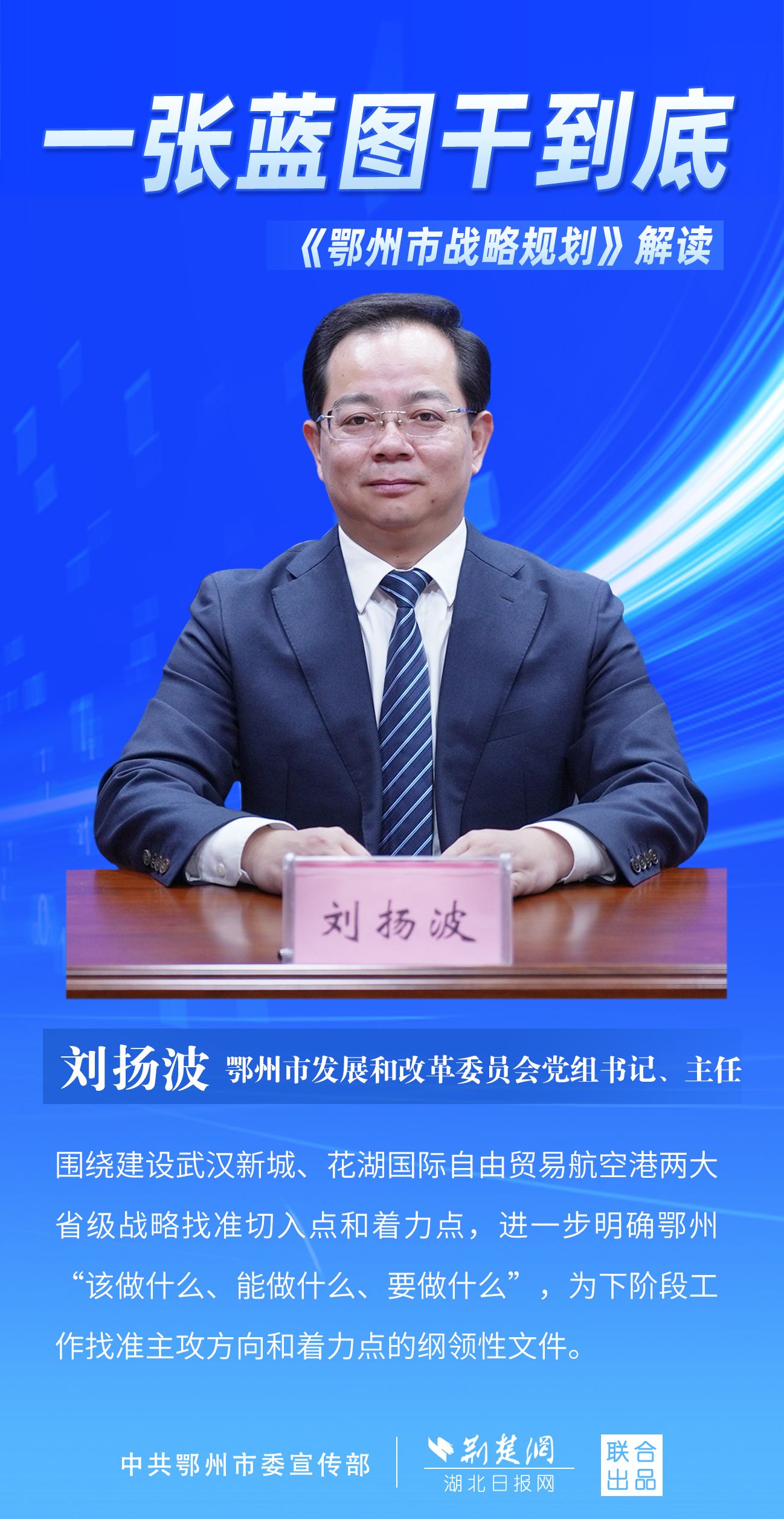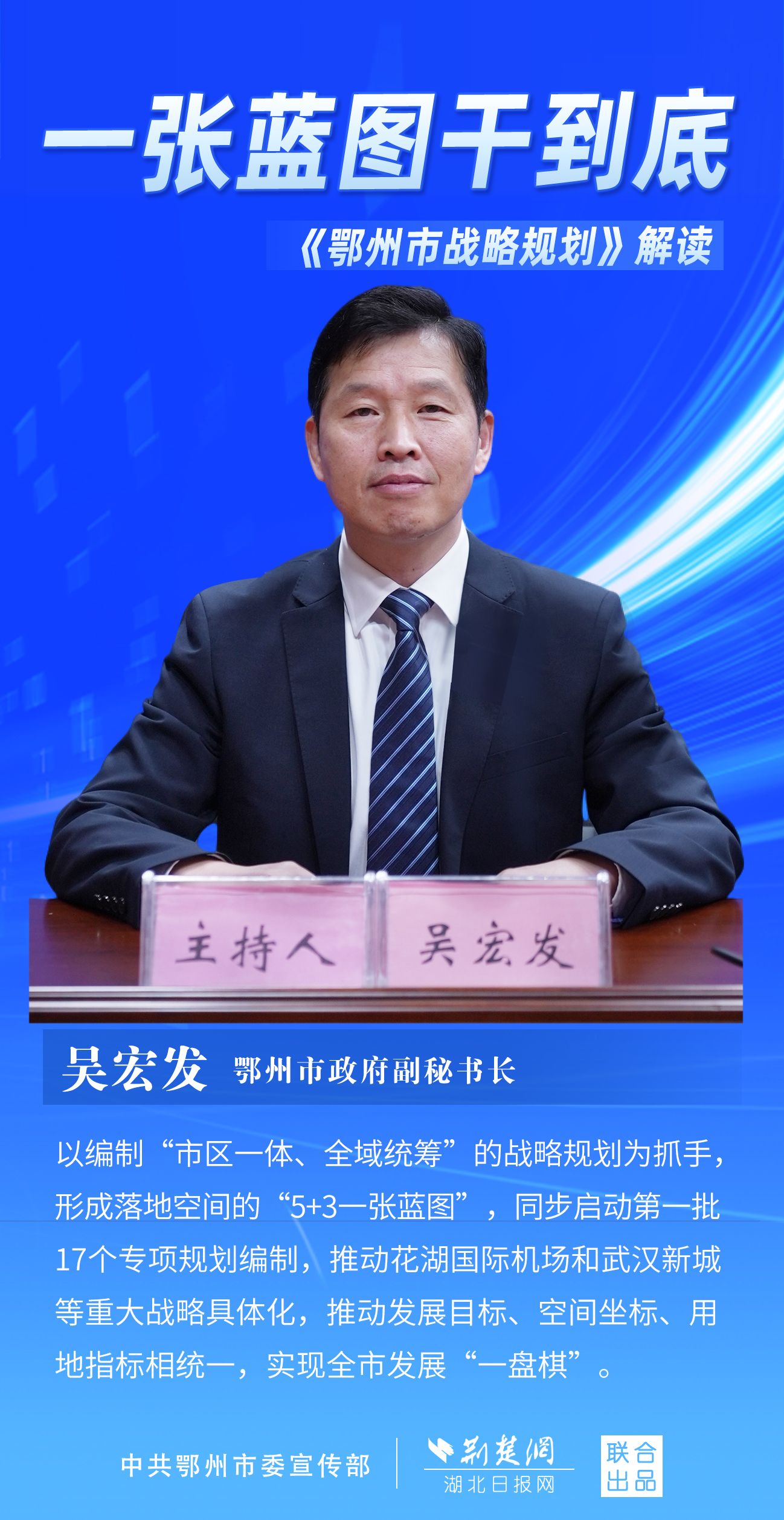 荊楚網(wǎng)(湖北日報網(wǎng))訊(記者 劉璐、金康 通訊員 胡彥)11月7日上午,鄂州市召開新聞發(fā)布會,宣布《鄂州市戰(zhàn)略規(guī)劃》即將印發(fā)實施。市委副秘書長、市委政研室主任游惠民透露,從機制優(yōu)化、指標考核、項目實施等方面確保規(guī)劃制度有依據(jù)、成效可考核、實施有抓手。具體如何落實落地?讓我們用一組海報解讀《鄂州市戰(zhàn)略規(guī)劃》。
