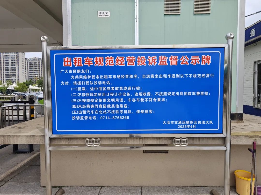 值得注意的是,今年7月,市交通運(yùn)輸綜合執(zhí)法大隊(duì)在大冶北站出站口設(shè)置了出租車投訴點(diǎn),旁有“出租車規(guī)范經(jīng)營投訴監(jiān)督公示牌”,明確拒載、不按規(guī)定使用計(jì)價(jià)設(shè)備等行為可在此投訴。