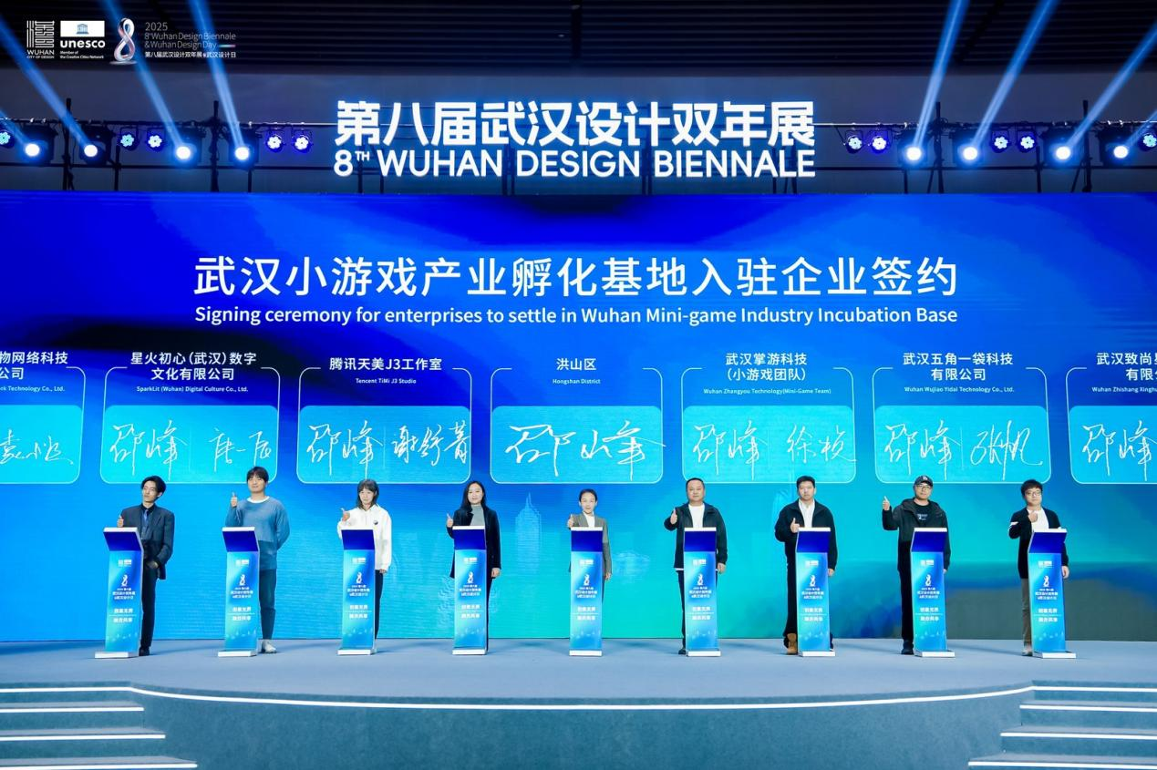 榮譽(yù)之外,產(chǎn)業(yè)合作是設(shè)計(jì)價(jià)值轉(zhuǎn)化的關(guān)鍵。開(kāi)幕式現(xiàn)場(chǎng),8家企業(yè)簽約入駐全國(guó)首家小游戲產(chǎn)業(yè)孵化基地——“武漢市小游戲產(chǎn)業(yè)孵化基地”,他們中既有充滿朝氣的新生代小游戲團(tuán)隊(duì),也有掌游科技這樣的行業(yè)領(lǐng)軍者,更有騰訊天美J3工作室等頂尖力量,他們將攜手打破行業(yè)邊界、共享資源平臺(tái),共同推動(dòng)數(shù)字創(chuàng)意產(chǎn)業(yè)與設(shè)計(jì)融合發(fā)展。