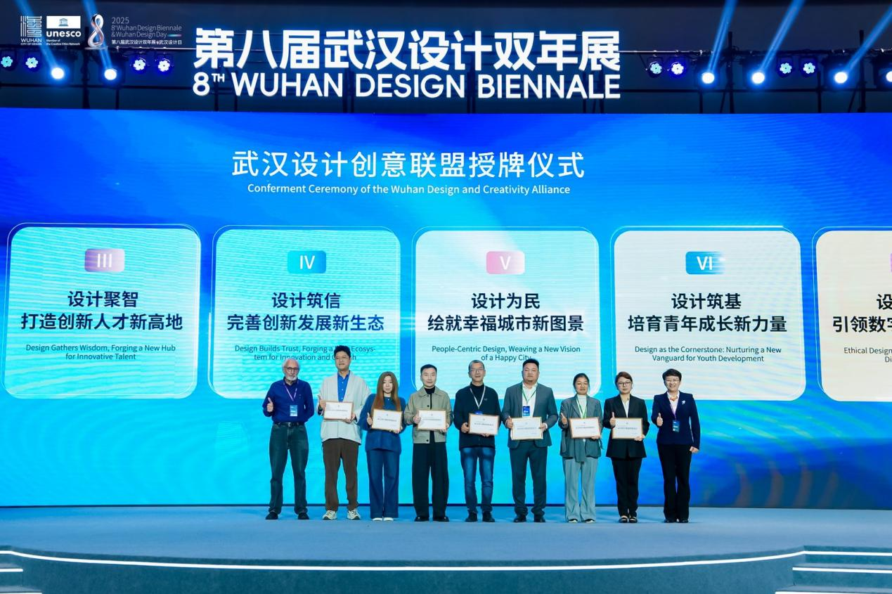 武漢有設(shè)計(jì)相關(guān)專(zhuān)業(yè)高校50余所,設(shè)計(jì)專(zhuān)業(yè)在校學(xué)生近10萬(wàn)人,設(shè)計(jì)相關(guān)企業(yè)突破1萬(wàn)家,10余個(gè)設(shè)計(jì)行業(yè)協(xié)會(huì),從業(yè)人員超50萬(wàn),形成了強(qiáng)大的“設(shè)計(jì)創(chuàng)意聯(lián)盟”,催生出了集產(chǎn)業(yè)鏈、創(chuàng)新鏈、人才鏈、價(jià)值鏈于一體的融合創(chuàng)新發(fā)展生態(tài)體系。在開(kāi)幕式的最后,“武漢設(shè)計(jì)創(chuàng)意聯(lián)盟”正式授牌,來(lái)自設(shè)計(jì)企業(yè)、行業(yè)協(xié)會(huì)、高校院所和獨(dú)立設(shè)計(jì)師等領(lǐng)域多元設(shè)計(jì)力量代表共同見(jiàn)證。未來(lái),“武漢設(shè)計(jì)創(chuàng)意聯(lián)盟”將奮力實(shí)現(xiàn)設(shè)計(jì)融城,構(gòu)筑協(xié)同發(fā)展新范式;設(shè)計(jì)賦能,激活產(chǎn)業(yè)升級(jí)新動(dòng)能;設(shè)計(jì)聚智,打造創(chuàng)新人才新高地;設(shè)計(jì)筑信,完善創(chuàng)新發(fā)展新生態(tài);設(shè)計(jì)為民,繪就幸福城市新圖景;設(shè)計(jì)筑基,培育青年成長(zhǎng)新力量;設(shè)計(jì)向善,引領(lǐng)數(shù)字文明新航向;設(shè)計(jì)聯(lián)通,拓展國(guó)際交往新空間八大目標(biāo)。