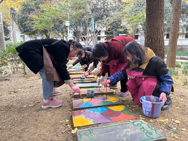 30余名黨員與社區(qū)居民攜手執(zhí)筆,在社區(qū)能人的指導(dǎo)下,依據(jù)設(shè)計(jì)圖稿細(xì)心勾勒線條,精心調(diào)配赭石、石青、石綠等傳統(tǒng)礦物色彩,悉心填充花瓣、枝葉。草坪里原本素樸的地磚漸漸綻放出繽紛圖景:象征革命精神的紅色印記、勾勒武昌古城風(fēng)貌的文化符號,以及依循“十二花令”鋪陳的水仙、桃花、菊花等時(shí)令花卉與梅蘭竹菊的清雅風(fēng)骨藝術(shù)化呈現(xiàn)。