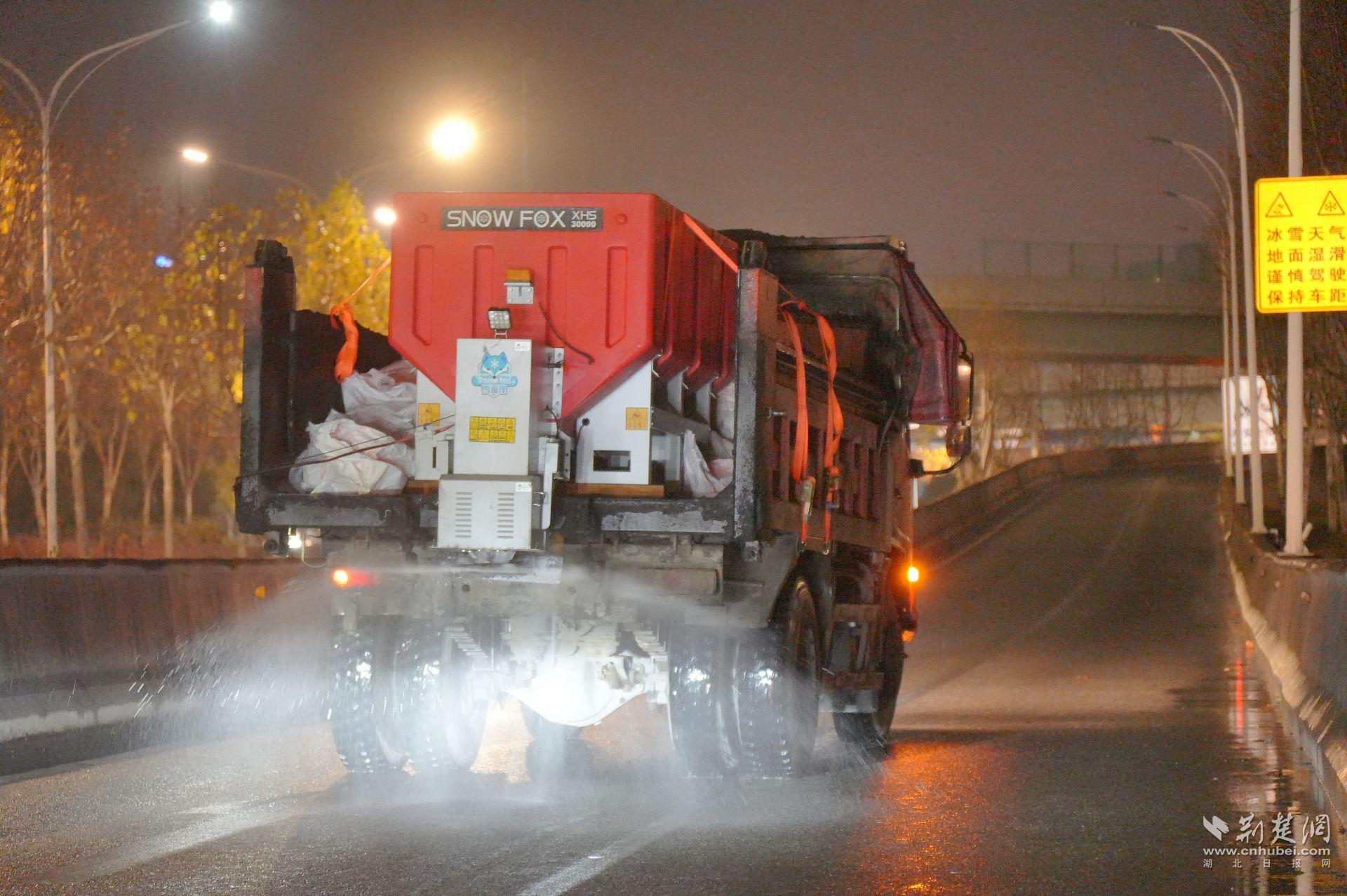 指令發(fā)出后,一線力量迅速到位。22時左右,硚孝高速匝道口,區(qū)服投臨空港市政環(huán)衛(wèi)公司的三臺融雪劑撒布機(jī)同步作業(yè)。融雪劑被均勻鋪撒在匝道和橋面,為后續(xù)可能出現(xiàn)的結(jié)冰提前“打底”。