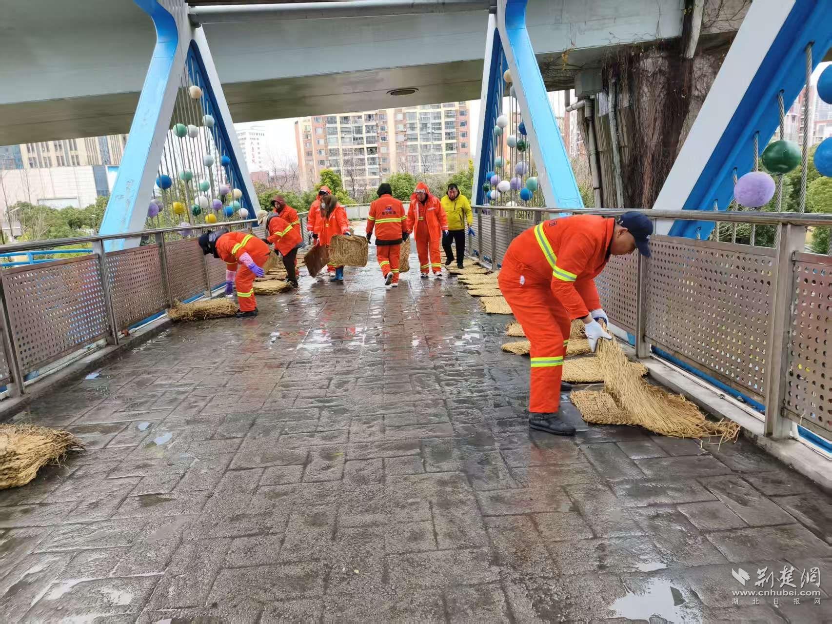 防滑措施同樣向行人集中區(qū)域延伸。19日17時起,吳家山環(huán)山路人行天橋上,環(huán)衛(wèi)工人與執(zhí)法隊(duì)員開始鋪設(shè)防滑草墊。“橋兩側(cè)是學(xué)校,晚高峰和早高峰人流集中,提前鋪設(shè)能減少滑倒風(fēng)險。”吳家山街綜合執(zhí)法中心副主任陳偉說。