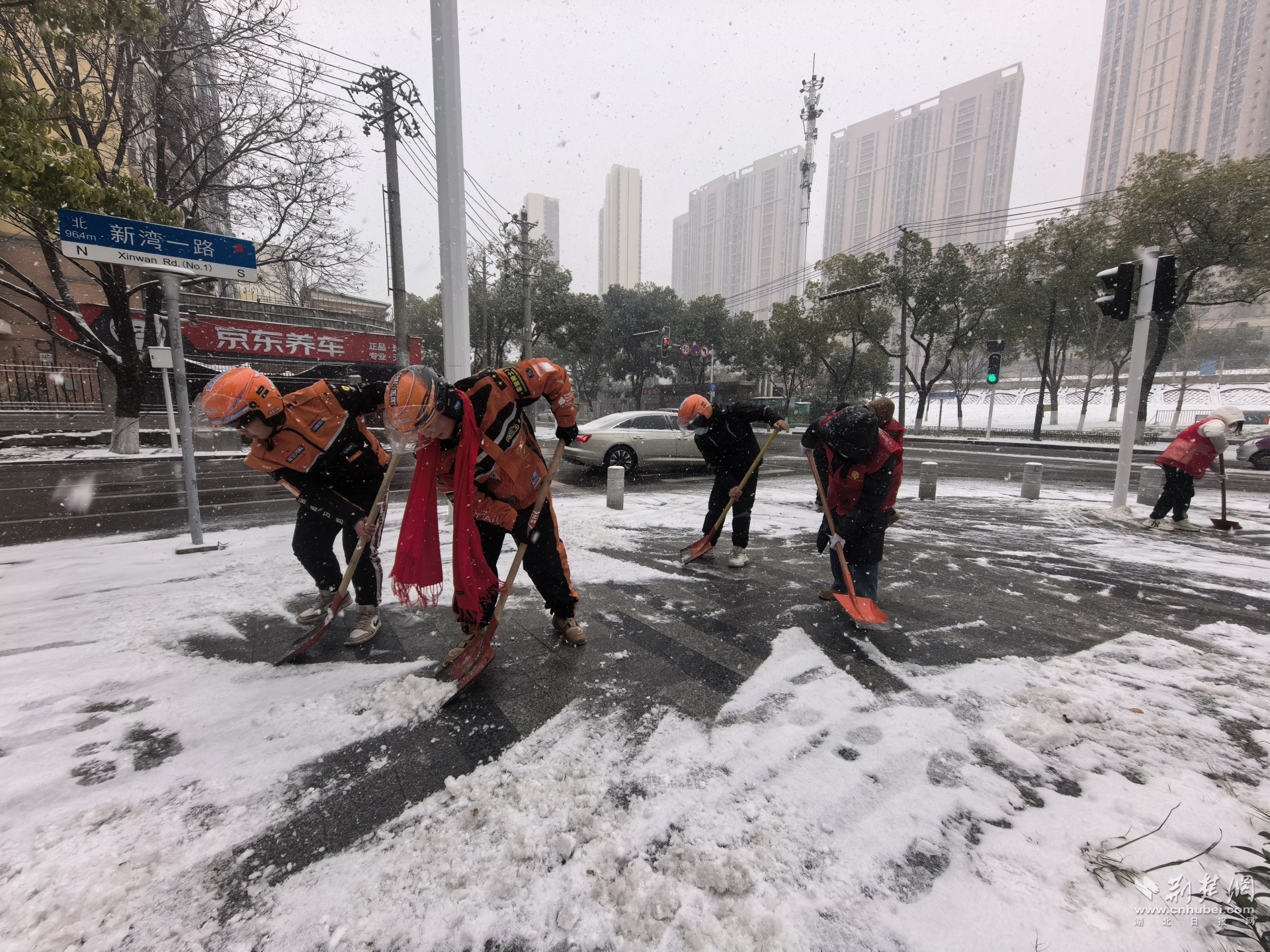 在花樓水塔街道,“蜂火輪”、“順豐掃雪隊(duì)”等志愿力量迅速集結(jié),30余名騎手、快遞員主動(dòng)走上主次干道和小區(qū)道路,清理積雪、鏟除暗冰。在他們最熟悉的配送路線中,一條條安全通道被打通。