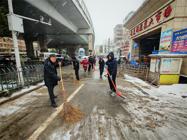 紫陽市場監(jiān)管所組織武泰閘市場及志愿者清雪除冰。 通訊員供圖