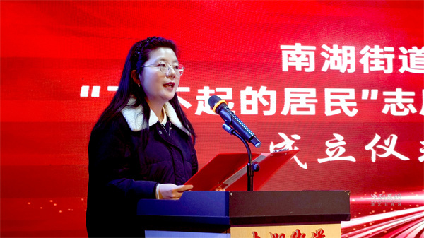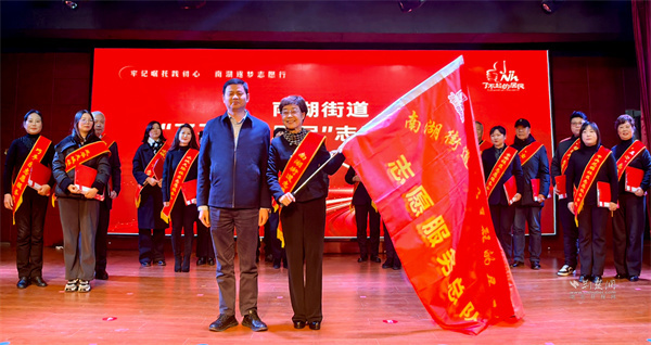 活動的另一重頭戲,是“了不起的居民”志愿服務總隊的成立儀式。在區(qū)委社會工作部部長謝琬宣讀成立文件后,區(qū)委副書記、統(tǒng)戰(zhàn)部部長劉海停上臺為總隊隊長張淑靜授旗,標志著南湖街道近300支活躍的志愿服務隊伍,有了統(tǒng)一的旗幟與核心。