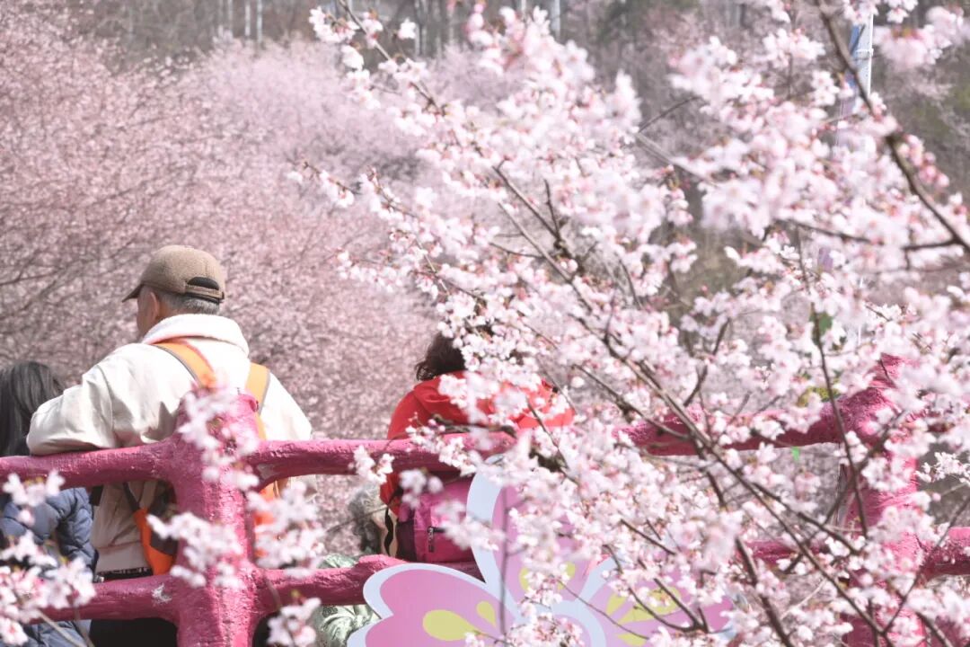 步入景區(qū),綿延道路兩側(cè)櫻花成廊,花枝交錯(cuò)如云似霞。層層花瓣在陽(yáng)光下熠熠生輝,粉白相間、隨風(fēng)輕搖,勾勒出如夢(mèng)似幻的春日盛景。游客們漫步其間,拍照打卡、駐足欣賞,在山野間沉浸式感受櫻花與春光的雙重浪漫。