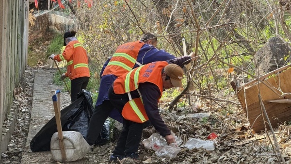 工作人員與志愿者穿梭于陡坡之上、溝壑之間,手持夾鉗、垃圾袋,逐點摸排、逐處清理,不放過任何一個隱蔽角落。從坡頂?shù)狡碌祝瑥氖p到樹叢,枯枝落葉、白色垃圾、廢棄雜物被一一清理出來,讓坡地逐漸顯露出原本的清爽模樣。對于清理出的各類垃圾,現(xiàn)場實行分類收集、閉環(huán)清運,確保整治見底見效,堅決杜絕二次污染。