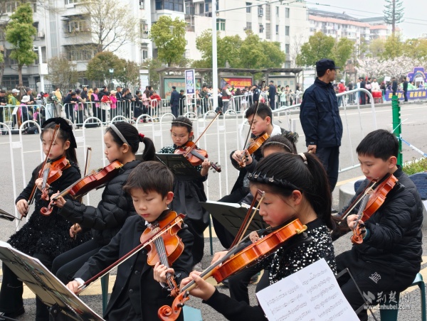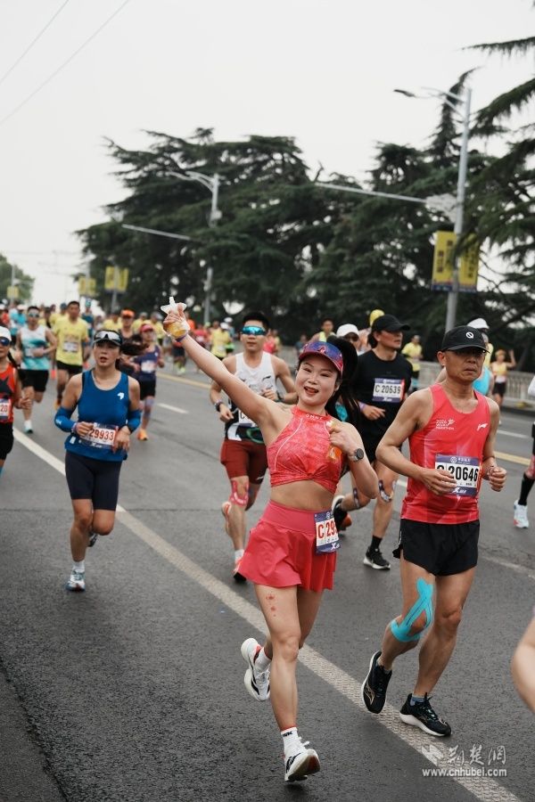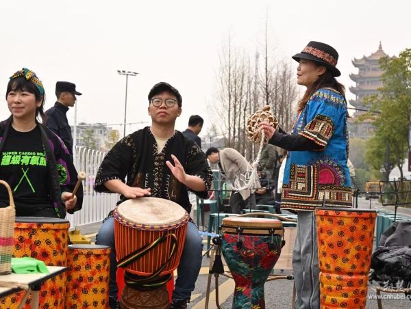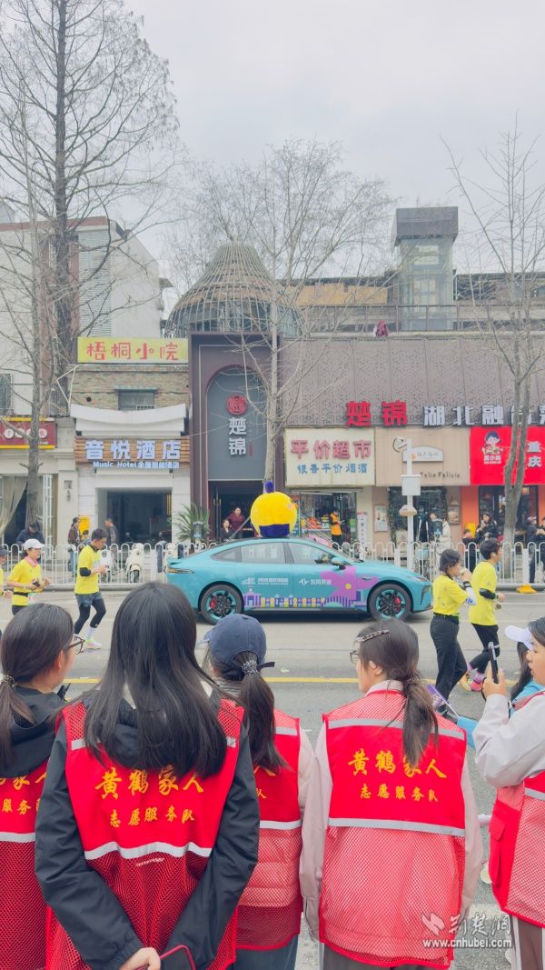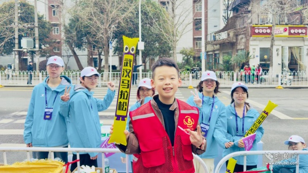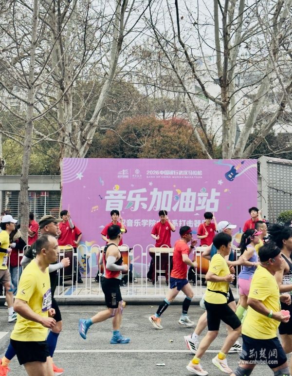 他們手持彩旗、奏響樂器,用旋律和吶喊在賽道旁匯聚成一道道流動的風(fēng)景線。鼓聲、樂聲、歡呼聲交織在一起,奏響了春日江城最動聽的交響曲。