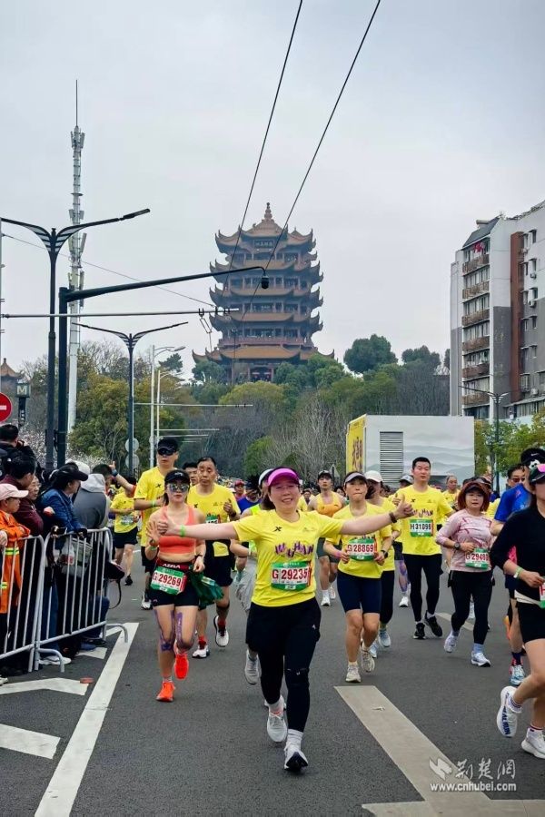 隨著發(fā)令槍響,跑者們?nèi)绯彼阌縼?。?dāng)?shù)谝惶蓐?duì)經(jīng)過黃鶴樓腳下時,賽道兩側(cè)瞬間沸騰。吶喊聲、加油聲此起彼伏,街道工作人員和居民志愿者們揮舞著手臂,用最飽滿的熱情為每一位跑者鼓勁助威。