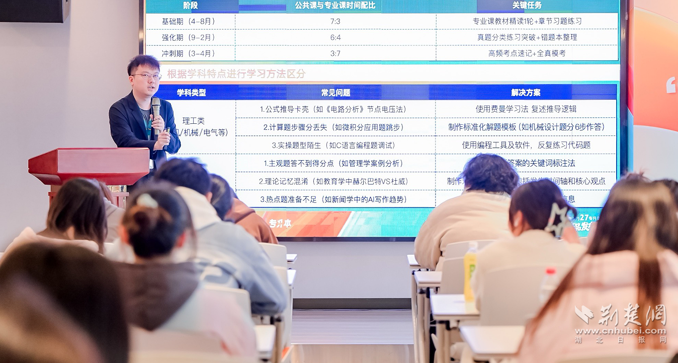 備考先知情,方能贏在起點。發(fā)布會上,教學(xué)負(fù)責(zé)人胡誠林,圍繞湖北省專升本公共課考情回顧及2027備考規(guī)劃展開詳細(xì)分享。他重點拆解了《大學(xué)英語》這一核心公共課的考試要求、題型迭代規(guī)律及難度變化趨勢,針對考生最關(guān)心的詞匯積累、語法掌握、閱讀理解、書面寫作四大模塊,提供了可落地、可執(zhí)行的備考策略。從詞匯記憶的高效方法、語法考點的重點突破,到閱讀技巧的精準(zhǔn)運用、寫作能力的分層提升,胡誠林老師進(jìn)行了全方位、系統(tǒng)化的解析,為考生搭建起清晰的公共課備考框架,幫助大家精準(zhǔn)把握備考節(jié)奏,做到游刃有余。