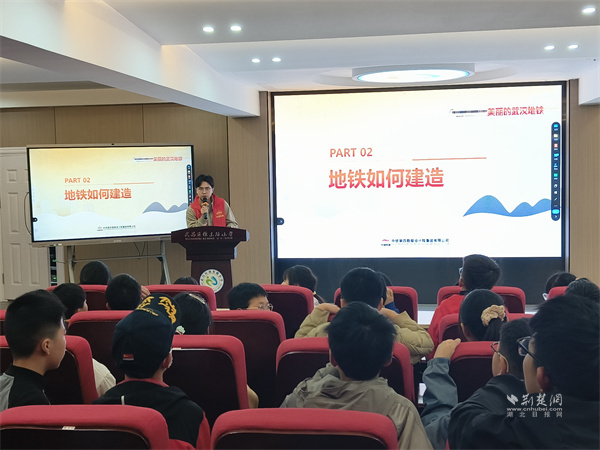 城地院志愿者華銳哲用趣味問答解答“地鐵是如何修建的”。他將盾構(gòu)機比作“鋼鐵蚯蚓”,講解刀盤啃巖、管片筑墻、高精度導(dǎo)航避迷路的工作原理,針對孩子們提出的“碰到大石頭怎么辦”等疑問,生動介紹了孤石爆破、溶洞灌漿等地下施工技巧。同時,他以徐東路小學(xué)旁武漢地鐵5號線為例,講述著特色站點的匠心獨運,以及自動駕駛列車穿梭于城市脈搏中的智能與從容。