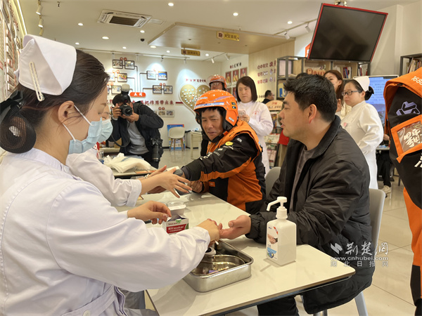 活動特別設(shè)置自由提問與便民服務(wù)環(huán)節(jié),將服務(wù)窗口“零距離”前移。社保處工作人員一對一解讀新就業(yè)形態(tài)人員個人養(yǎng)老保險政策;漢口銀行工作人員同步普及個人公積金政策,并開通社??ā凹磿r辦”綠色通道,騎手們可在咨詢間隙現(xiàn)場辦結(jié),切實踐行“數(shù)據(jù)多跑路,群眾少跑腿”的服務(wù)理念。同時,武漢市第三醫(yī)院醫(yī)療隊將義診服務(wù)送進驛站,為到場騎手逐一測量血壓、檢測血糖,結(jié)合戶外作業(yè)特點送上針對性健康指導(dǎo)。