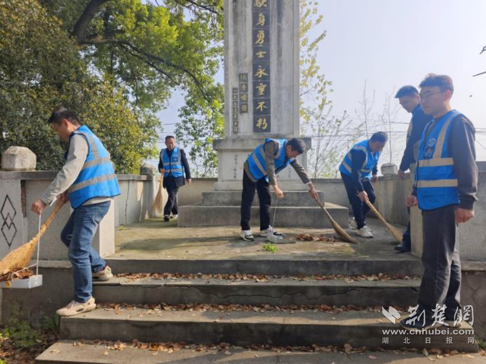 大家懷著崇敬的心情認(rèn)真清理落葉雜物。通訊員供圖