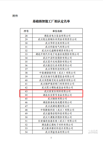荊楚網(wǎng)(湖北日報(bào)網(wǎng))訊(通訊員 曾靜子 范漫 望亞男)近日,武漢市經(jīng)濟(jì)和信息化局發(fā)布《關(guān)于2026年基礎(chǔ)級智能工廠擬認(rèn)定名單的公示》。經(jīng)企業(yè)自主申報(bào)、各區(qū)推薦及市級復(fù)核等程序,湖北農(nóng)發(fā)集團(tuán)旗下武漢家家樂飼料有限公司與湖北農(nóng)發(fā)零號食品有限公司成功入選。本次全市共有57家單位獲得認(rèn)定,兩家子公司位列其中。