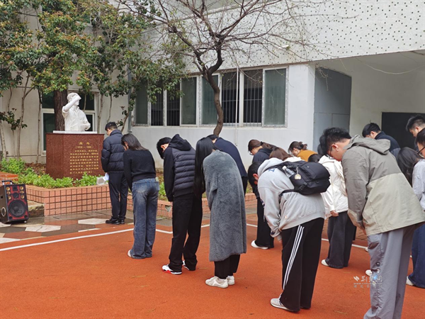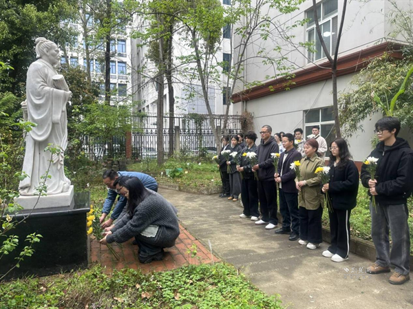 4月3日上午,在求索書院屈原塑像前,在“荊楚風(fēng)流”與“玉蘭學(xué)府”群體塑像旁,文學(xué)院師生代表為屈原、李白、蘇東坡、魯迅等文學(xué)巨匠的塑像細(xì)細(xì)拂拭塵埃,敬獻(xiàn)素菊。師生們低首默哀,仿佛穿越時(shí)空,與先賢展開一場(chǎng)跨越千年的對(duì)話。