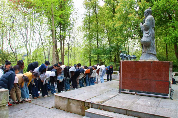 文學(xué)院師生代表在楚風(fēng)園的荊楚風(fēng)流—-歷史名人漢白玉雕像區(qū)向炎帝、楚先王、楚莊王、老子、屈原、王昭君、諸葛亮、孟浩然、陸羽、畢昇、李時(shí)珍、張居正、張之洞等先賢拜祭并獻(xiàn)花。 通訊員周晚霞 攝