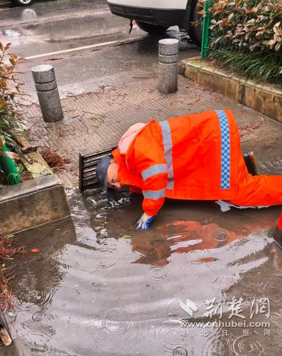 在街道的主次干道上,一群“橙色身影”同樣在風(fēng)雨中逆行。晨曦路、康泰路沿線,雨水裹挾著落葉、淤泥和塑料袋涌入雨水井,排水口頻頻告急。湘口街環(huán)衛(wèi)中心20名作業(yè)人員頂風(fēng)冒雨,對(duì)40余處井蓋展開緊急清淤。黨齡32年的彭新山俯身徒手掏挖的身影格外引人注目。他半跪在積水中,手持鐵鉤撬開井蓋,直接探進(jìn)胳膊一把把掏出堵塞的枯枝爛葉,泥漿濺滿臉身也渾然不顧?!斑@個(gè)口子堵得厲害,不掏干凈路面積水下不去,老百姓走路、開車都危險(xiǎn)?!?/span>