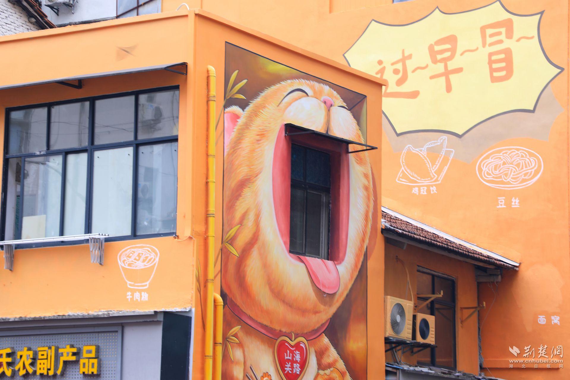 荊楚網(wǎng)(湖北日報網(wǎng))訊(記者 何婧 通訊員 董德禹 馮夏雪)近日,前往江岸區(qū)山海關(guān)路過早、打卡的市民游客驚喜地發(fā)現(xiàn),一只只憨態(tài)可掬的貓咪悄然“爬”上了老街墻面。明快活潑的橙色墻面上,貓咪們或低頭品嘗熱干面、豆皮等武漢本土美食,或蹲坐窗臺、漫步藤蔓間,配合爪印、小吃等趣味元素,生動點綴著街巷。一句地道的武漢方言問候“過早冒”,引得不少市民游客會心一笑,這些貓咪也因此被親切地稱為“過早貓”。