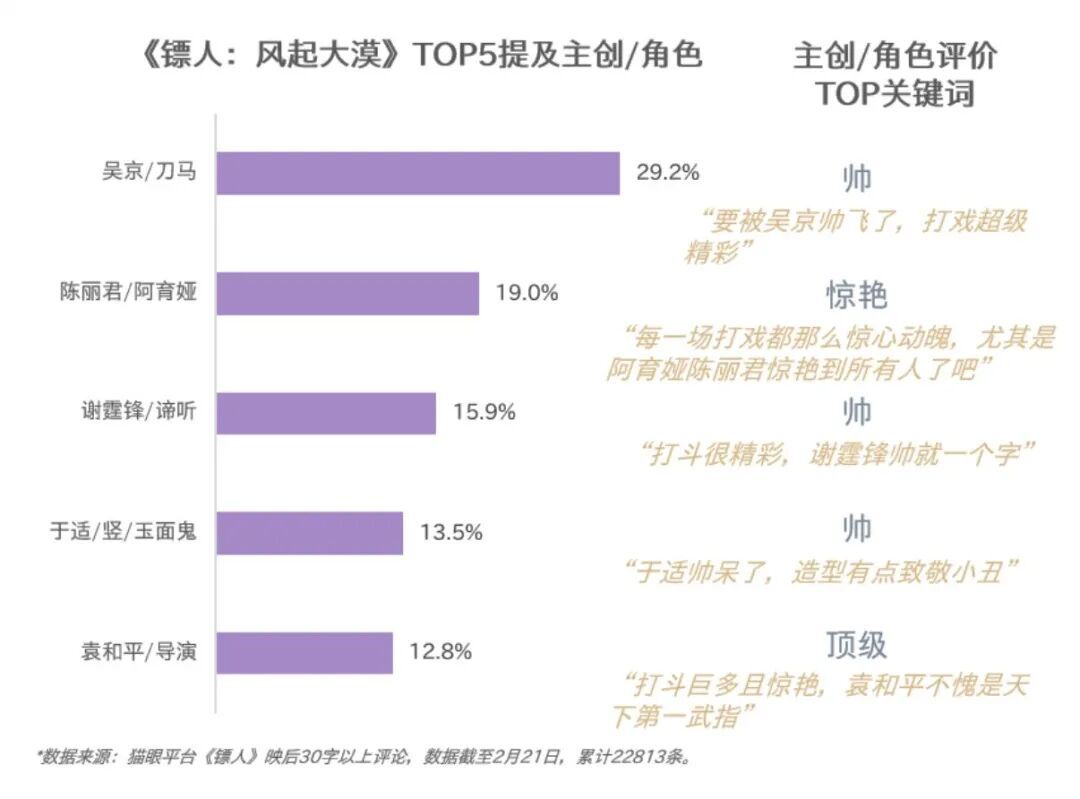 值得一提的是,在貓眼平臺影片評論區(qū),陳麗君飾演的阿育婭獲得女性觀眾的高度好評,觀眾提及率僅次于吳京飾演的主角刀馬,讓影片在核心男性受眾之外,實現(xiàn)了受眾圈層的突破。
